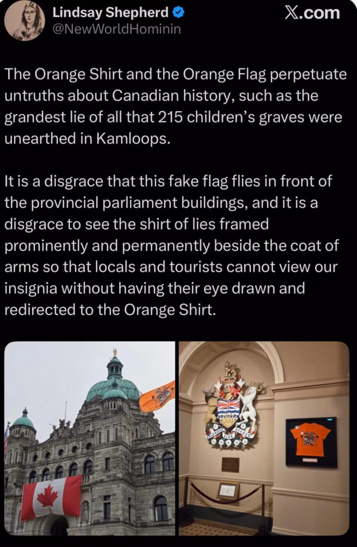 “It is a disgrace that this fake flag flies in front of the provincial parliament buildings, and it is a disgrace to see the shirt of lies framed prominently and permanently beside the coat of arms so that locals and tourists cannot view our insignia without having their eye drawn and redirected to the Orange shirt,” the post continued.